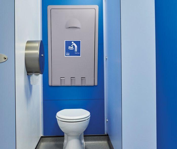 Vertical fold-down changer which is ideal for more confined areas like toilet cubicles. Built-in Microban antibacterial protection, safety straps and liner dispenser. Internal pneumatic mechanism for easy one-handed opening. Comes complete with steel mounting brackets. Universal instruction graphics and safety messages in six languages and braille.